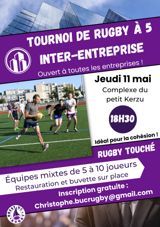 Pour la 2ème édition, le Brest Université Club rugby organise un tournoi inter-entreprise qui aura lieu au stade du petit Kerzu, le jeudi 11 mai 2023 à partir de 18h30.